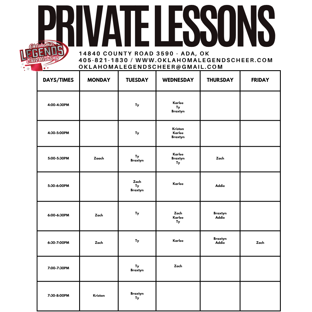 To enroll in a private lesson please email oklahomalegendscheer@gmail.com or text 405.821.1830 to enroll.